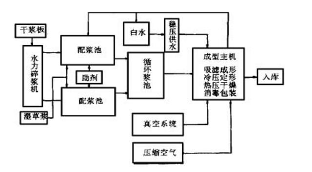 生產(chǎn)線是由兩臺真空模塑成形主機(jī)系統(tǒng)和與主機(jī)規(guī)模相適應(yīng)的輔助系統(tǒng)所組成, 其生產(chǎn)工藝如下:原料甘蔗漿(干漿或濕漿) 制漿,配漿,輸漿,成型主機(jī)(注漿、吸濾成形、熱壓定型、真空熱干),切邊,檢驗,成品消毒、包裝,入庫。